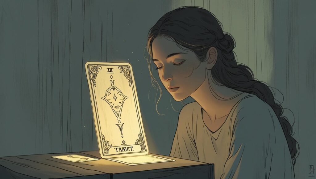 陰すぴれー新タロット講座の表紙。サイズ9×16でひらめきとタロットと女性の画像を作ってください。イメージは神秘的。シンプルで親しみやすいイメージ。