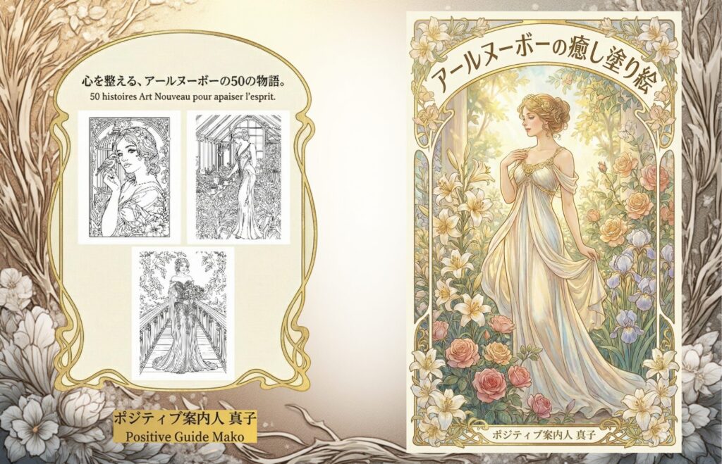 【大人の塗り絵/Adult coloring book】2025年12月4冊目出版・販売開始いたしました!4冊目は日本語で『アールヌーボの癒しの塗り絵』これまでの龍系『Sacred Japanese Dragons & Floral Mandalas』他とマニアックな部屋『25 Rooms』と違い女性らしい大人の塗り絵に仕上げました!